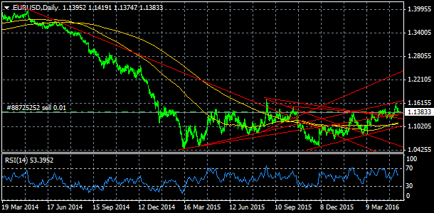 Euro k dolaru k nedělnímu závěru obchodování klesá 0,1 % na 1,138. Sestupný květnový trend ale podle krátkodobé technické analýzy trvá. Euro během jara rostlo po březnovém rozhodnutí ECB úrokových sazeb a monetární politiky, které na rozdíl od podobné situace ve čtvrtém čtvrtletí 2015 zaskočilo trhy razancí navýšení silné monetární expanze.