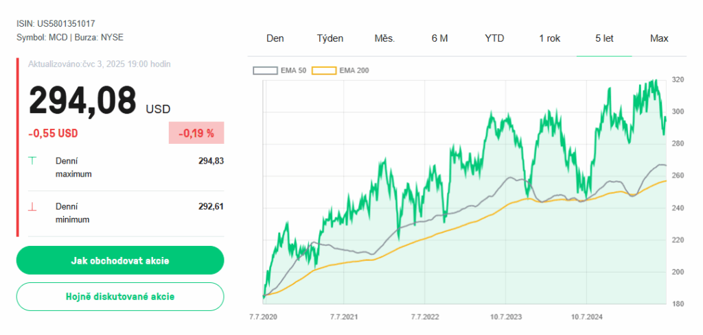K 7.7.2025 se akcie MCD obchodovaly kolem 294 USD. McDonald’s je členem amerických burzovních indexů S&P 500 a Dow Jones.